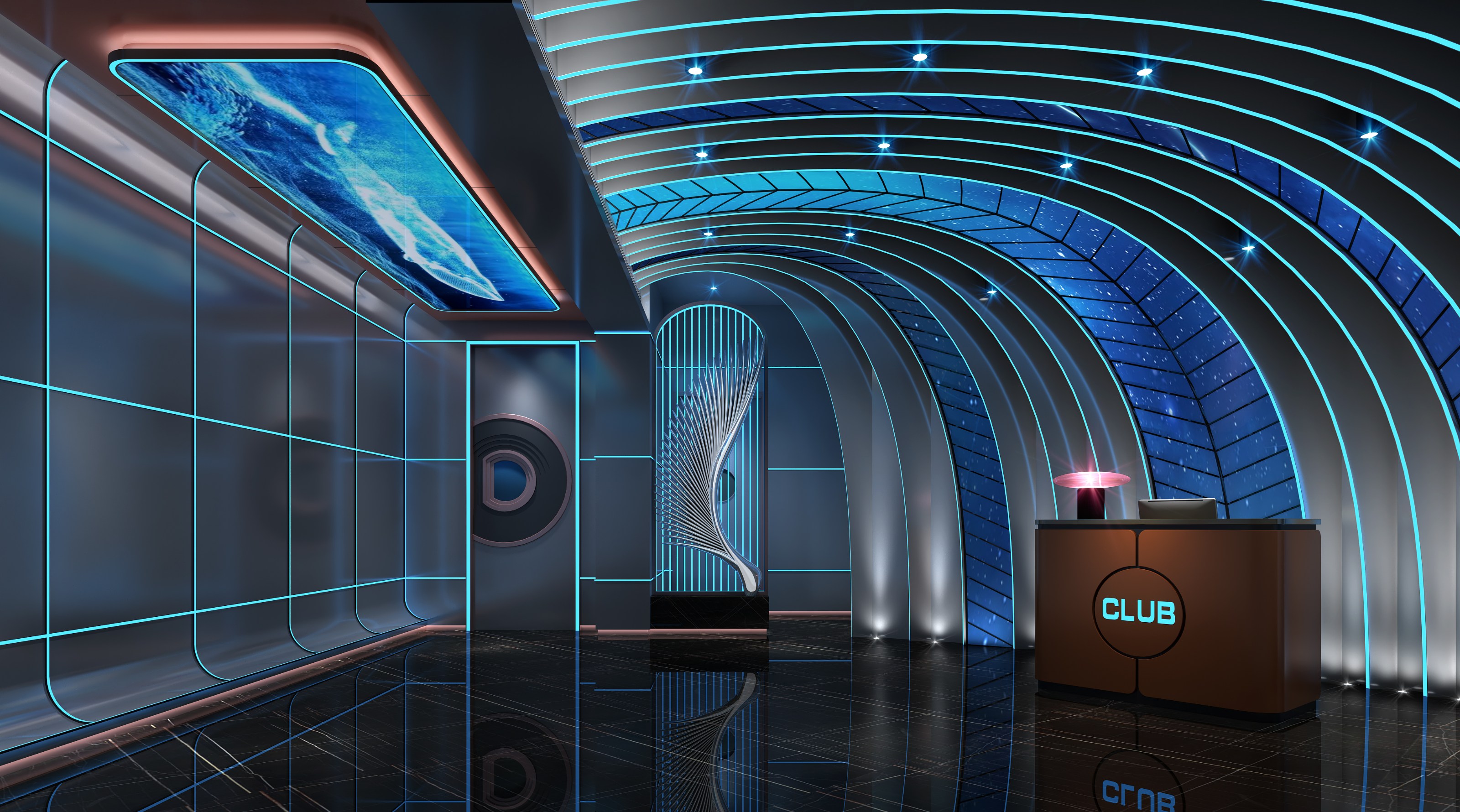 走道設(shè)計(jì)依舊延續(xù)前臺接待區(qū)風(fēng)格,兩側(cè)墻面用平整圓滑的銀色金屬色澤建材作為鋪墊,其上布滿排列有序的藍(lán)色燈帶,吊頂?shù)拿總€(gè)間隔區(qū)域均采用一整塊凸顯海底天然景觀的燈牌,用這種擠滿眼部視線的方式讓消費(fèi)者沉浸在由設(shè)計(jì)師一手構(gòu)建出的海底世界中。地面設(shè)計(jì)選擇光滑的大理石板,能最大程度的映射墻壁燈光和吊頂燈牌景色,讓整個(gè)走道空間更加和諧統(tǒng)一,融為一體。